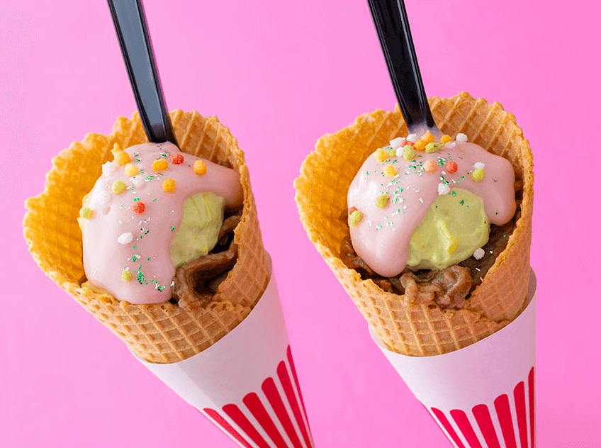 まるでアイスのような見た目のお食事メニューとなっています。コーンの中には牛カルビやマッシュポテトが入っています。