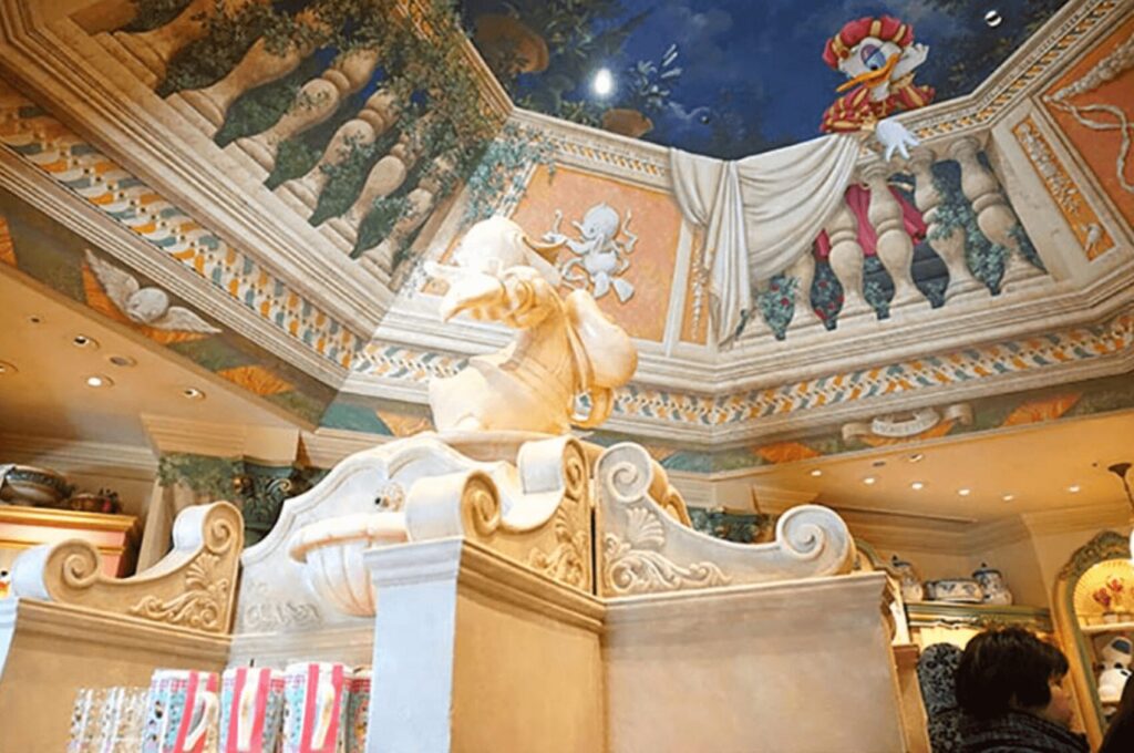 店内のレジ後ろには、ドナルドとデイジエットが出会ったパーティーの様子を描いた壁画が飾られています。