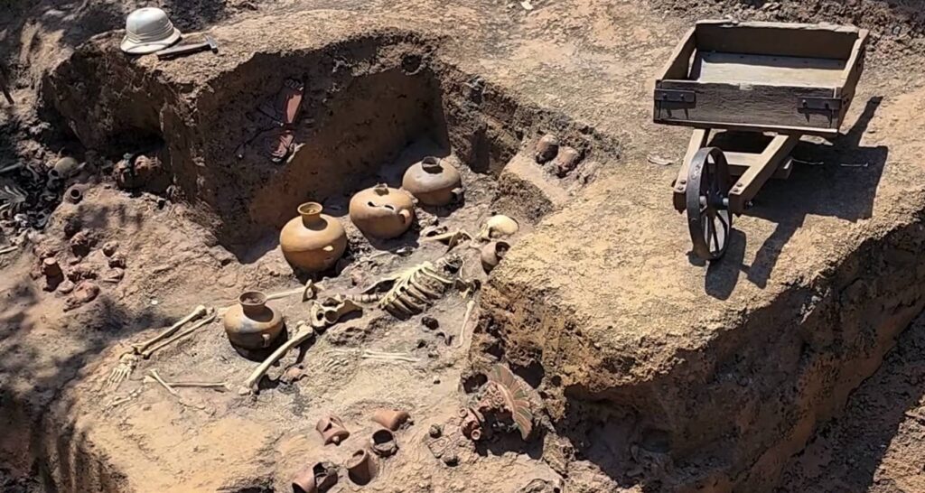 遺跡調査の名残からか、レストランの周辺には採掘途中の様子が見られ、謎の石板や骨董品、人の骨などが掘り起こされています。